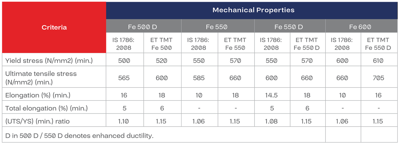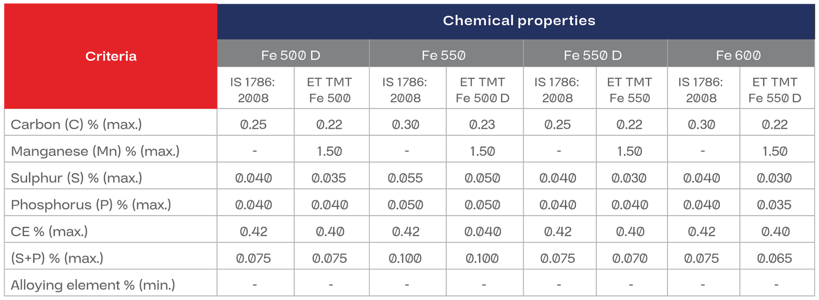 Superior elongation properties, a high UTS/YS ratio and lower carbon, sulphur and phosphorous quantities. This helps help preserve the steel and resist earthquake shocks.